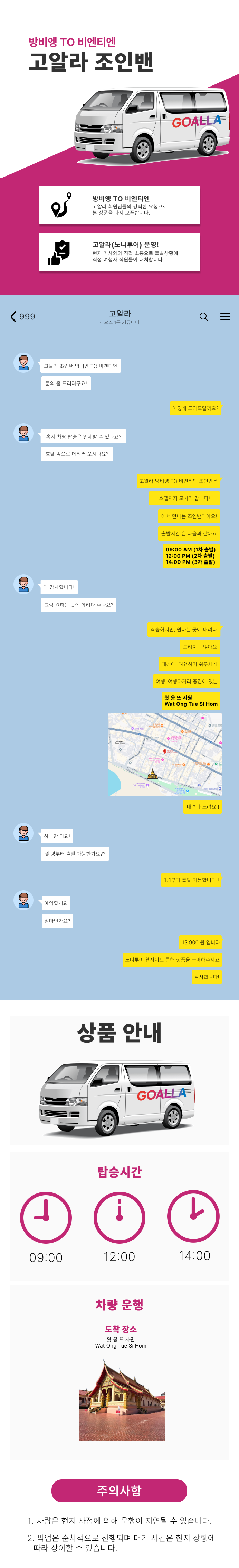 [편도][라오스 조인밴] 방비엥->비엔티안 (호텔픽업해드립니다!!) 🚐 방비엥에서 비엔티엔 이동 이제는 고민금지!! 🚐 노니투어(고알라)가 다시 고객 여러분께 서비스를 제공합니다! 🚐 여행의 마무리까지 편안하고 쾌적하게! 🚐 호텔 순차픽업으로 시작해서 비엔티안 여행자 거리에 내려드려요! 고객센터 전화번호 : 02-778-8800 고알라 카카오톡 채널로 문의주시면 신속하게 답변해드립니다! ❗탑승 시 주의 사항❗ 📢<필독> 꼭 읽어주세요! [출발 시간과 대기 시간 안내] 🔸숙소 픽업이 오래 걸릴 수 있으며 조인밴 특성상 모든 승객이 탑승 완료되어야 출발이 가능합니다. 🔸손님이 많을 경우 출발이 지연될 수 있으며, 최대 1시간 이상 대기할 수도 있으니 꼭 확인 부탁드립니다. <이동 차량 안내> 🔸승객 수에 따라 45인승 버스나 미니버스로 이동할 수 있습니다. 🔸평소에는 주로 밴을 이용하지만, 상황에 따라 차량 종류가 달라질 수 있으니 참고 바랍니다. 라오스의 특성과 여유로운 이용을 부탁드립니다. 라오스의 특성상 시간 준수가 어렵고 변수가 많습니다. 여행자분들의 이해와 협조에 감사드리며 편안한 여정을 위해 최선을 다하겠습니다! 🫡