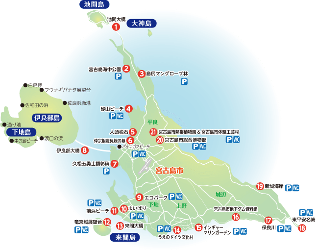 토리이케 – 마키야마 전망대 – 이라부대교 – 미야코 선셋비치 – 산에 미야코지마 시티